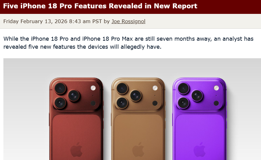 【环球网科技综合报道】2月14日,据外媒macrumors报道,距离iPhone 18 Pro与iPhone 18 Pro Max正式发布尚有7个月,分析师Jeff Pu在周四发布的研究报告中,率先披露了该系列机型的五大核心新功能,涵盖外观、影像、性能、通信等多个维度,引发全球苹果用户关注。此外,报告还透露了该系列机型的传闻配色,包括酒红色和紫色等新选择。
